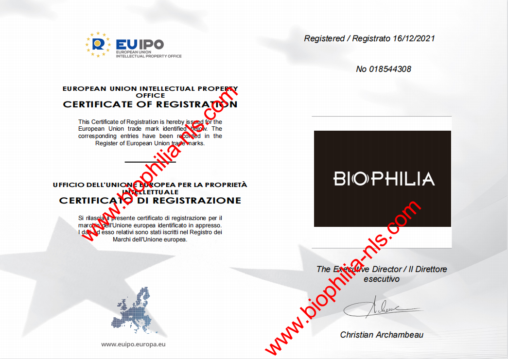 BIOPHILIA KRIJGEN EUROPESE UNIE INTELLECTUELE EIGENDOM CERTIFICAAT VAN REGISTRATIE